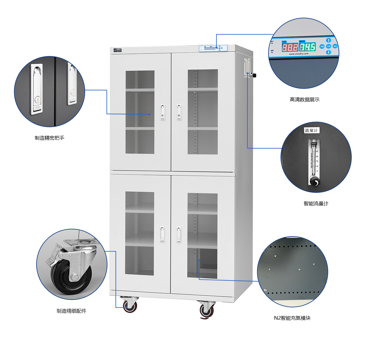 1.智能充氮:加装自动充氮系统一套后湿度达到设定值时停止充氮,反之超标则自动补充氮气,有利于快速降湿和防止半导体等器件的氧化。