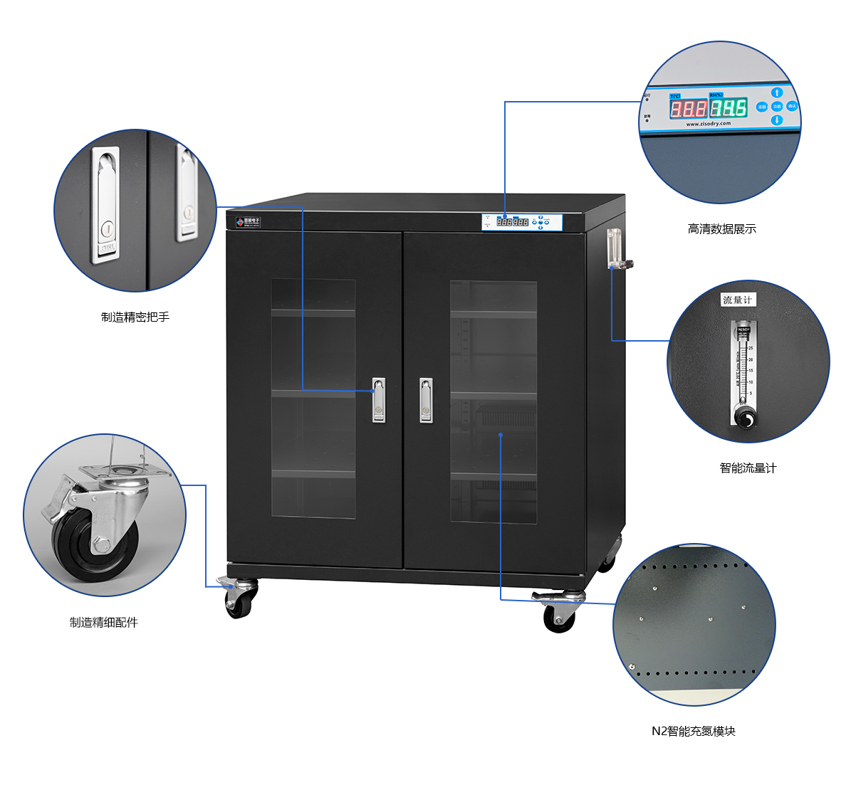 1.智能充氮:加装自动充氮系统一套后湿度达到设定值时停止充氮,反之超标则自动补充氮气,有利于快速降湿和防止半导体等器件的氧化。